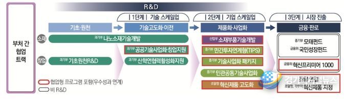먼저, 부처간 협력과 민간 생태계와의 연계를 강화하여 R&D 성과가 성장 단계별로 신속하게 이어지도록 하는 범부처 ‘R&D 성과확산 고속도로’를 구축한다. 현재는 부처별 사업이 분절적으로 운영되고 있어 기술⸱기업 성장 단계별 사업간 긴밀한 연계 체계 구축에는 한계가 있었다. ‘R&D 성과확산 고속도로’ 구축을 통해 기초⸱원천 연구가 기술 스케일업, 실증⸱사업화를 거쳐 금융 지원과 판로 개척까지 신속하게 이어지도록 하고, 이를 효과적으로 추진하기 위해 협업형 예산 대상을 확대하고 평가를 연계하여 연구성과 확산을 촉진한다.