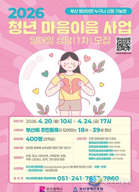경기디지털뉴스 마성숙 기자 | 부산시는 정서적으로 어려움을 겪는 청년들의 마음 회복을 돕기 위해 '2026년 청년 마음이음 사업' 참여자를 모집한다고 밝혔다.