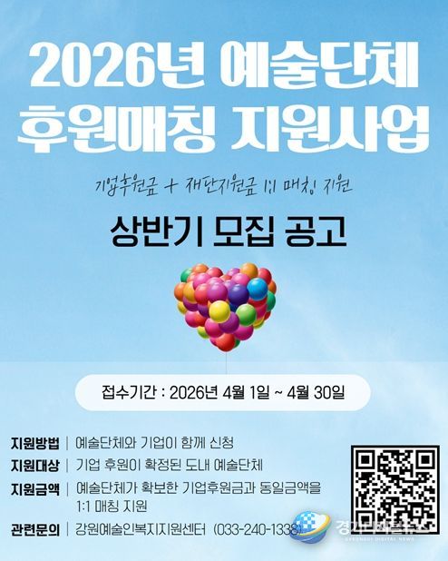 경기디지털뉴스 마성숙 기자 | 강원문화재단은 도내 예술단체의 안정적인 창작기반 마련과 기업의 문화예술 후원 참여 확대를 위해 '2026년 예술단체 후원매칭 지원사업' 상반기 공모를 추진한다.