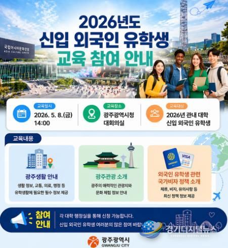 광주광역시는 오는 5월 8일 오후 2시 시청 대회의실에서 광주지역 대학에 입학한 유학생들을 대상으로 ‘2026년 신입 외국인 유학생 교육’을 실시한다.