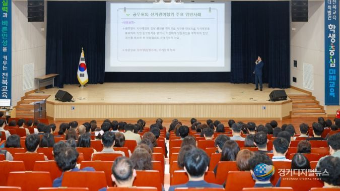 경기디지털뉴스 마성숙 기자 | 전북특별자치도교육청은 6월 3일 치러지는 전국동시지방선거를 앞두고 공무원의 정치적 중립 의무에 대한 이해를 높이고 선거 관련 위법행위를 사전에 예방하기 위해 17일 창조나래 시청각실에서 전 직원 대상 직장교육을 실시했다.