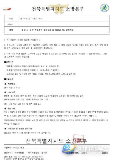 소방 관계자는 “소방관서는 어떠한 경우에도 소화기나 소방시설물 구매를 강요하지 않으며, 특정 업체 결제나 현금 입금을 요구하지 않는다”며 “정식 공문은 우편이나 관용 메일로만 발송되므로 문자로 발송된 공문은 반드시 의심해야 한다”고 강조했다.