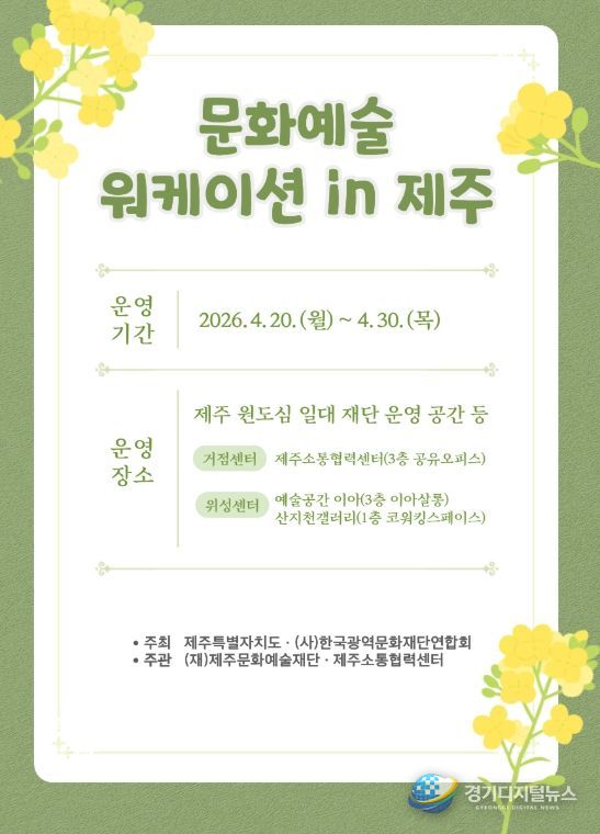 경기디지털뉴스 마성숙 기자 | 제주특별자치도와 한국광역문화재단연합회가 주최하고 제주문화예술재단(이사장 김석윤)이 주관하는 2026년 ‘문화예술 워케이션 in 제주’ 1차 프로그램이 오는 20일부터 4월 30일까지 운영된다.
