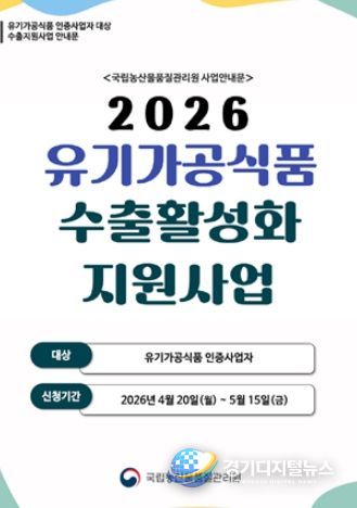 경기디지털뉴스 마성숙 기자 | 국립농산물품질관리원은 국내 유기가공식품의 해외 시장 진출을 돕기 위해 20일부터 ‘2026년 유기가공식품 수출 활성화 지원사업’을 추진한다고 밝혔다. 해외 시장 진출에 어려움을 겪는 유기가공식품 인증사업자들에게 수출 준비부터 해외 구매자 연결까지, 맞춤형 지원을 제공해 판로 확대에 기여할 것으로 기대된다.