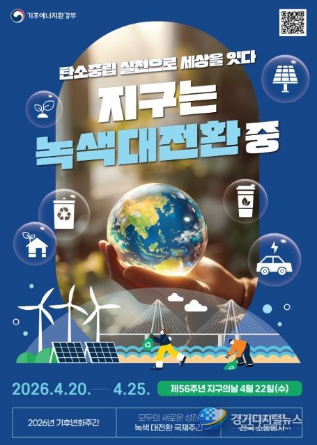 경기디지털뉴스 마성숙 기자 | 기후에너지환경부는 지구의 날(4월 22일)을 맞아 4월 20일부터 24일까지 ‘2026년 기후변화주간’을 개최한다. 올해 기후변화주간은 ‘녹색대전환 국제주간(4.20~4.25)’과 연계되어 국제사회의 탄소중립 기술과 정책, 국민의 일상 속 기후행동 실천이 함께 어우러지는 탄소중립 실천문화 확산을 위한 참여와 공감의 장이 마련될 전망이다.