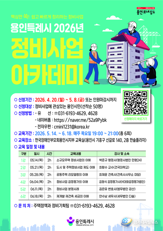 용인특례시(시장 이상일)는 4월 20일부터 5월 8일까지 ‘2026년 정비사업 아카데미’ 수강생을 모집한다.