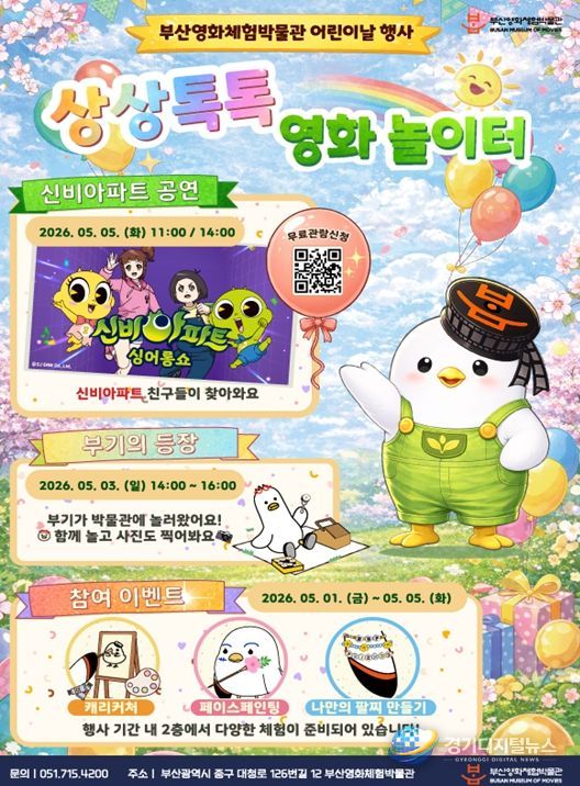 경기디지털뉴스 마성숙 기자 | 부산시는 부산영화체험박물관(관장 박채성, 중구 소재)에서 어린이날을 맞아 어린이와 가족 관람객을 위한 특별 행사 '상상톡톡 영화 놀이터 : 다 같이 놀자!'를 오는 5월 1일부터 5일까지 5일간 개최한다고 밝혔다.