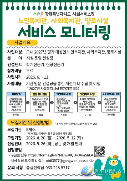 경기디지털뉴스 마성숙 기자 | 강원특별자치도 사회서비스원은 도내 사회복지시설의 서비스 품질 향상과 사회서비스 품질 표준화 체계 구축을 위해 오는 6월부터 ‘서비스 모니터링’ 사업을 추진한다.