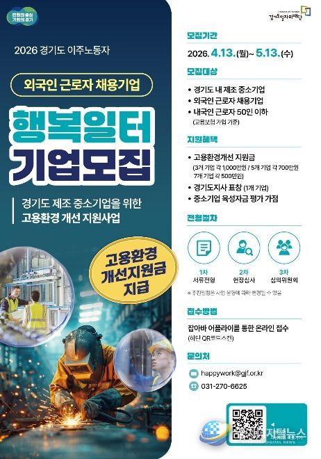 경기디지털뉴스 마성숙 기자 | 경기도와 경기도일자리재단은 도내 외국인 근로자를 고용한 중소 제조기업을 대상으로 ‘2026년 경기도 이주노동자 행복일터 선정사업’ 참여기업을 모집한다고 20일 밝혔다.