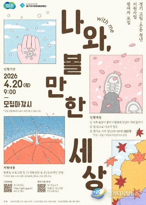 경기디지털뉴스 마성숙 기자 | 경기도가 사회적 관계가 단절된 고립·은둔 청년의 일상 회복을 돕기 위해 20일부터 ‘경기 고립·은둔 청년 지원사업: 나와(with me), 볼만한 세상’ 참여자 300명을 모집한다.