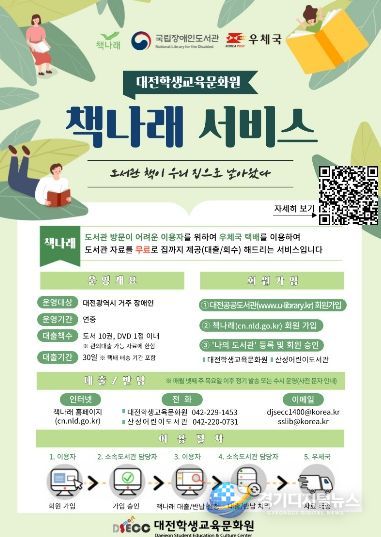 경기디지털뉴스 마성숙 기자 | 대전학생교육문화원은 봄철 외부 활동이 어려운 장애인과 65세 이상 어르신 등 독서 소외계층의 책 읽는 즐거움을 위해, 비대면 도서 대출 및 반납 서비스인 ‘책나래’ 사업을 4월부터 본격 추진한다고 밝혔다.