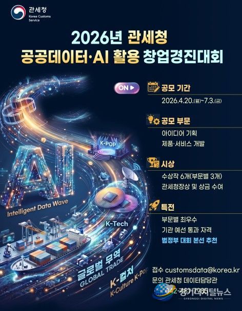 경기디지털뉴스 마성숙 기자 | 관세청은 공공데이터로 개방된 관세무역데이터에 인공지능 기술을 활용한 혁신적인 창업아이디어를 발굴·지원하기 위해 4월 20일부터 '2026년 관세청 공공데이터·인공지능(AI) 활용 창업경진대회'를 개최한다.
