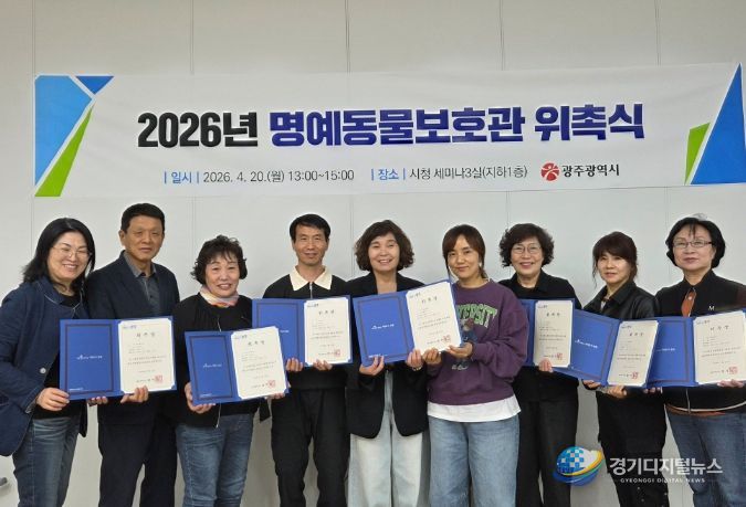 경기디지털뉴스 마성숙 기자 | 광주광역시는 20일 시청 세미나실에서 성숙한 반려동물 문화 정착과 동물복지 증진을 위한 ‘2026년 명예동물보호관 위촉식’을 개최했다.