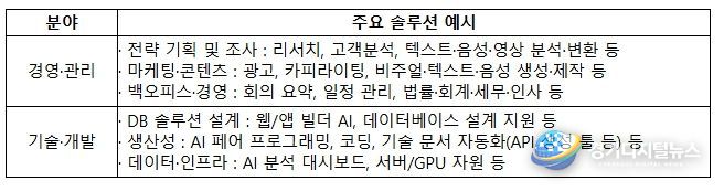 국내 유망 AI 벤처·스타트업을 대상으로 3월 9일부터 27일까지 AI 솔루션을 공모하여 총 370개를 접수했고, 접수된 370개 중 전략 기획, 마케팅·경영 등 ‘경영·관리 분야’에 270여개, 데이터·인프라, 프로그래밍 등 ‘기술·개발’ 분야에 100여개가 모집됐다.