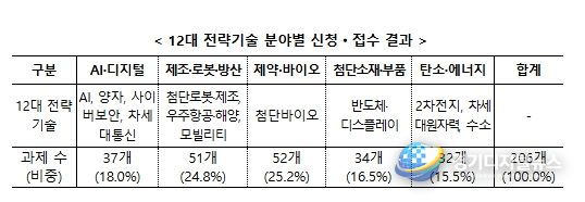 이번 공모는 12대 전략기술 분야를 중심으로 진행된 이번 공모는, 5대 전략기술 그룹 단위로는 제약·바이오 분야에 52개(25.2%), 제조·로봇·방산에 51개(24.8%), 인공지능(이하 AI)·디지털에 37개(18.0%) 등이 접수됐으며, 총 206개 접수 과제에 1,183개 기업·연구소 등이 참여 신청했다.