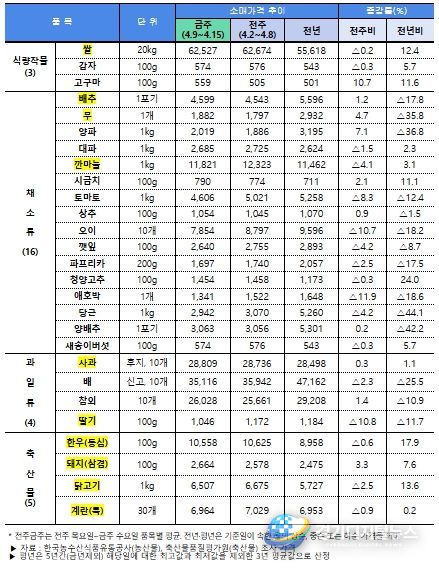 점검 결과, 농산물은 대다수 품목이 전년 대비 낮은 수준이다. 특히, 양파, 양배추, 당근 등 노지채소류는 가격이 큰 폭으로 하락함에 따라 시장격리, 정부 비축물량 출하정지와 함께 소비촉진을 추진하고 있다.
