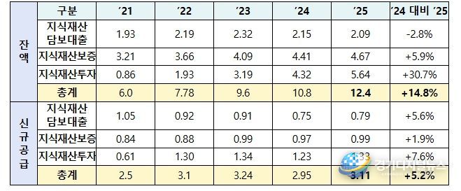 지식재산 금융 잔액은 ’24년 말 10.8조원에서 ’25년 말 12.4조원으로 증가하여 전년대비 14.8% 성장했다. 2025년 지식재산 금융 신규공급은 총 3.1조원으로, 2024년 2.95조원 대비 5.2% 증가했다.