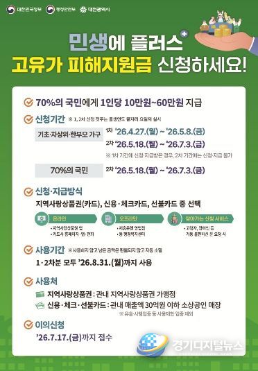 경기디지털뉴스 마성숙 기자 | 대전시는 국제 유가 상승에 따른 시민 부담을 완화하고 지역경제 안정을 도모하기 위해 고유가 피해지원금 전담 TF를 운영하고, 4월 27일부터 취약계층을 대상으로 1차 신청을 접수한다.