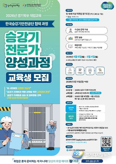 경기디지털뉴스 마성숙 기자 | 경기도일자리재단은 승강기 전문 인력 양성을 통해 일자리 문제 해결과 지역경제 활성화를 추진하고자 ‘2026년 승강기 전문가 양성 과정’ 교육생을 모집한다고 21일 밝혔다.