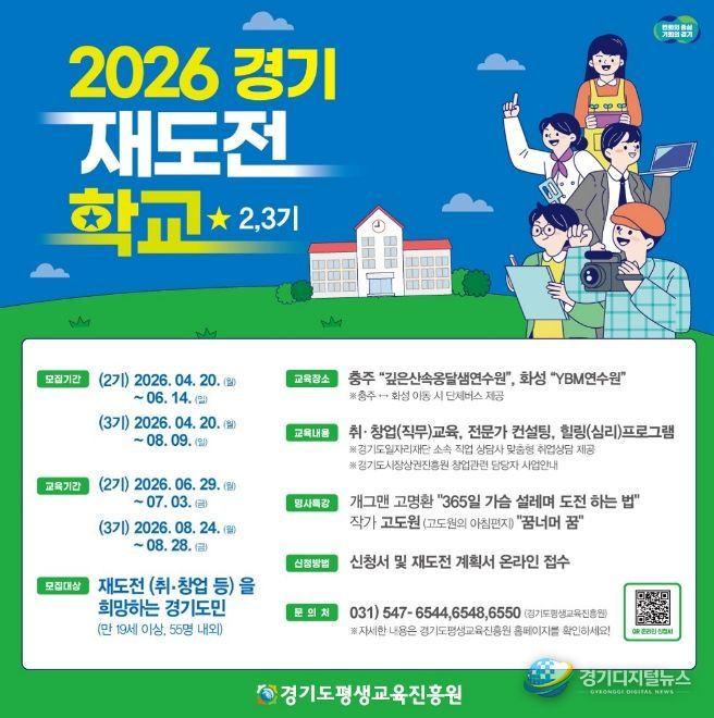 경기디지털뉴스 마성숙 기자 | 경기도와 경기도평생교육진흥원은 취업이나 창업 실패를 경험한 도민의 재기를 지원하기 위해 오는 20일부터 ‘2026년 경기 재도전학교’ 2~3기 참가자를 각각 55명 내외로 모집한다.