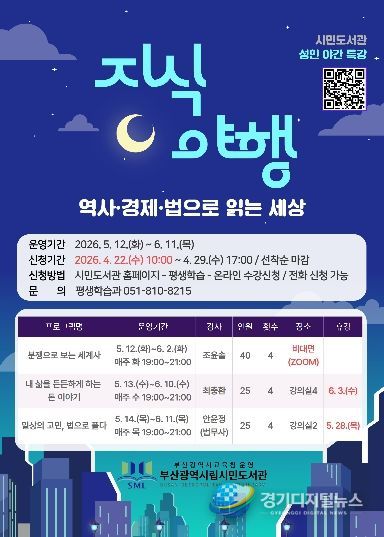 이은경 시민도서관장은 “직장인 등 낮 시간 이용이 어려운 시민들도 퇴근 후 배움을 이어갈 수 있도록 이번 야간 특강을 마련했다”며 “앞으로도 시민의 삶과 가까운 다양한 평생학습 프로그램을 지속적으로 확대해 나가겠다”고 말했다.