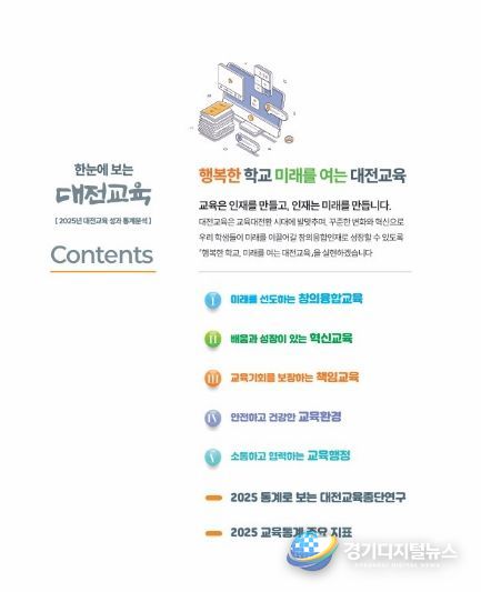 경기디지털뉴스 마성숙 기자 | 대전교육과학연구원 대전교육정책연구소는 2025년 대전교육 주요 정책의 성과를 종합적으로 분석한 ‘한눈에 보는 대전교육’을 발간했다고 밝혔다.