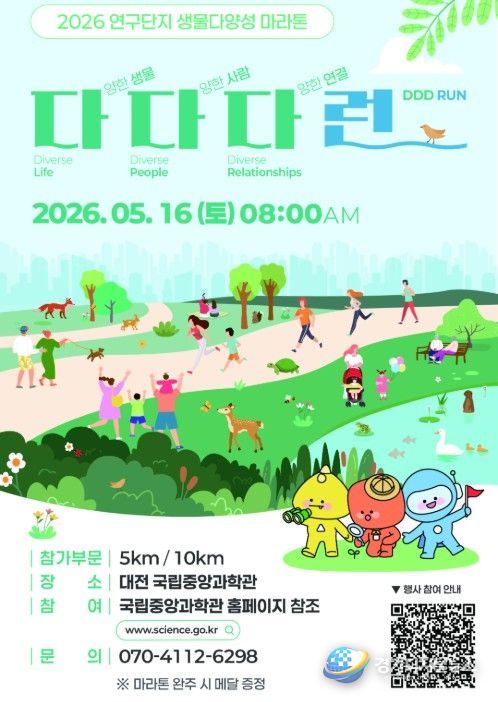 경기디지털뉴스 마성숙 기자 | 과학기술정보통신부 국립중앙과학관은 생물다양성의 소중함을 온몸으로 체감하고 일상 속 친환경 실천 문화를 확산하기 위한 2026 연구단지 생물다양성 마라톤 ‘다다다런(다양한 생물, 다양한 사람, 다양한 연결)’을 개최한다고 밝혔다.