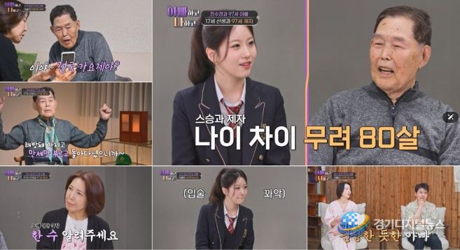 연습도 필요 없다는 아버지가 걱정이 된 딸 전수경은 “실수해서 ‘땡’하면 안 되니까 선생님을 모셨다”며 아버지와 함께 연습실로 향했다. ‘97세’ 전수경 아버지의 선생님이 될 주인공은 ‘트롯 공주’ 오유진이었다. 오유진은 쟁쟁한 어른들을 제치고 15살에 ‘미스트롯3’에서 미를 거머쥐었고, 현재 17세에 데뷔 6년 차에 들어섰다. 일일 선생님이 겨우 17살이라는 사실에 전수경 아버지는 깜짝 놀라 입을 다물지 못했다. 전수경은 “두 사람의 나이 차가 무려 80살이다”라며 너스레를 떨었다. ‘선생님’ 오유진의 나이를 들은 전수경 아버지는 “내가 17살에는 해방돼 가지고 만세만 부르고 돌아다녔다. 어른들이 깃대 들면 우리도 덩달아서 펄펄 뛰어다니며 흥으로 표현했다. 조금 있다가 6.25가 터졌다”며 차원이 다른 17세 시절을 고백해 스튜디오를 놀라게 했다.