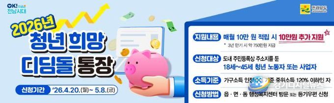 경기디지털뉴스 마성숙 기자 | 전라남도는 지역에서 일하는 청년의 안정적 자립과 자산 형성을 돕기 위해 ‘청년 희망디딤돌 통장’ 대상자 750명을 모집한다고 밝혔다.