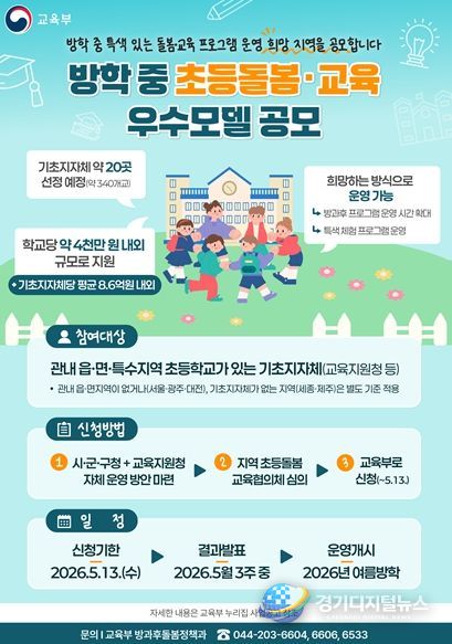 경기디지털뉴스 마성숙 기자 | 교육부는 4월 22일부터 5월 13일까지 2026년 방학 중 초등돌봄‧교육 우수모델을 운영할 기초지방자치단체 선정을 위한 공모를 실시한다.