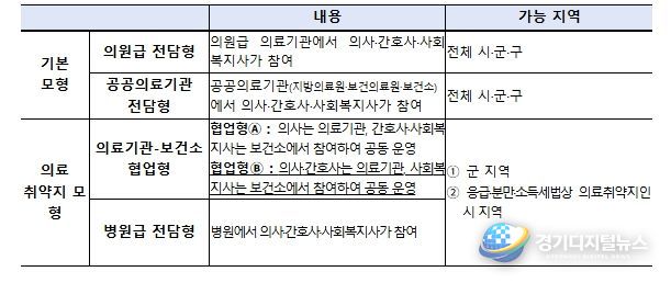 이번 공모에 신설된 모형을 포함한 재택의료센터 참여 모형은 다음 표와 같다.