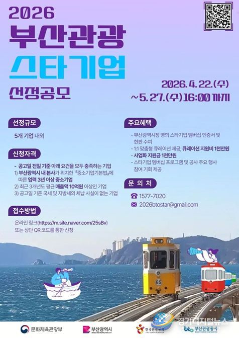 경기디지털뉴스 마성숙 기자 | 부산시와 부산관광공사는 부산관광기업지원센터가 외국인 관광객 500만 시대를 선도할 지역 관광산업의 핵심 주역을 발굴하기 위해 '2026 부산관광 스타기업 공모'를 실시한다고 밝혔다.