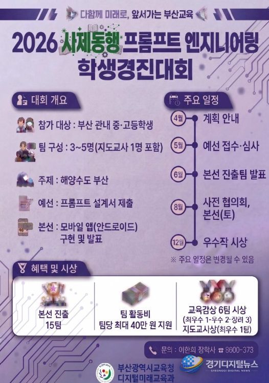 경기디지털뉴스 마성숙 기자 | 부산광역시교육청은 관내 중·고등학생과 교사가 한 팀으로 참여하는 ‘사제동행 2026 프롬프트 엔지니어링 학생경진대회’를 개최한다고 밝혔다.