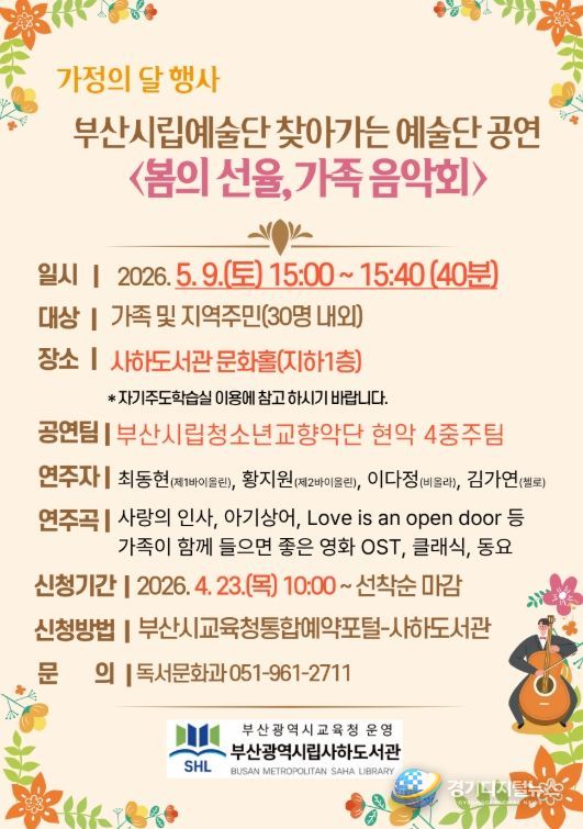 경기디지털뉴스 마성숙 기자 | 부산광역시립사하도서관은 가정의 달을 맞아 다음달 9일 오후 3시 도서관 문화홀에서 지역주민 30명을 대상으로 부산시립예술단 찾아가는 예술단 공연 ‘봄의 선율, 가족 음악회’를 개최한다.