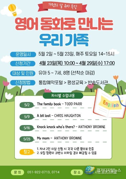 경기디지털뉴스 마성숙 기자 | 부산광역시립반송도서관은 다음달 2일부터 23일까지 매주 토요일마다 도서관 유아가족실에서 5~7세 유아 8명을 대상으로 가정의 달 유아 특강 ‘영어 동화로 만나는 우리 가족’을 운영한다.