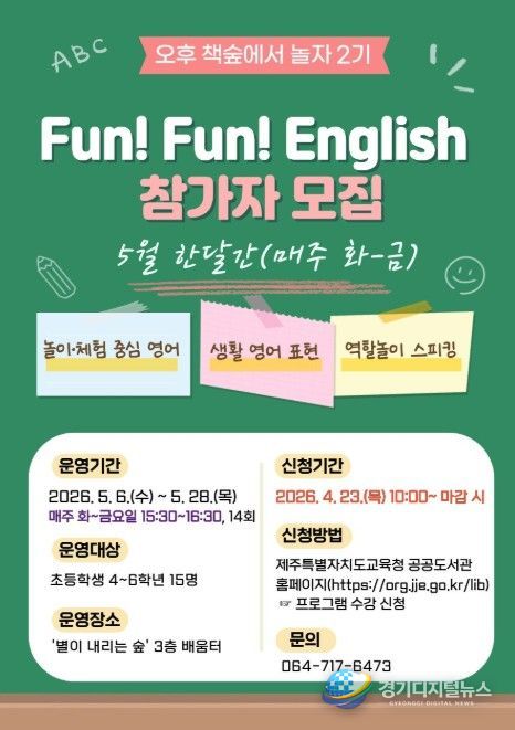경기디지털뉴스 마성숙 기자 | 제주도교육청 제주도서관은 방과 후 어린이를 대상으로 ‘2026년 오후 책숲에서 놀자’ 2기 펀! 펀! 잉글리쉬(Fun! Fun! English) 참가자를 모집한다.