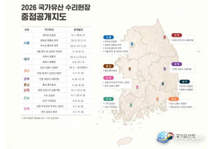 경기디지털뉴스 마성숙 기자 | 국가유산청은 국가유산 수리과정에 대한 국민의 이해를 높이고, 현장 체험 기회를 확대하기 위해 2026년 전국 주요 국가유산 수리현장 15개소를 선정하여 올해 12월까지 일반에 공개한다.