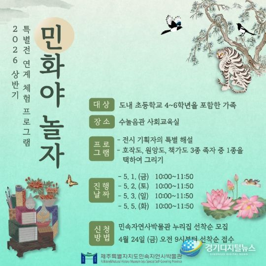 경기디지털뉴스 마성숙 기자 | 제주특별자치도 민속자연사박물관(관장 박찬식)이 5월 연휴 기간 민화 체험 프로그램 ‘민화야 놀자'를 운영한다.