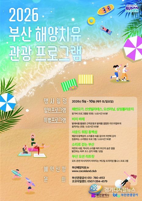 경기디지털뉴스 마성숙 기자 | 부산시는 오는 5월 1일부터 10월까지 매주 토·일요일에 부산의 7개 해수욕장(해운대, 송정, 광안리, 송도, 다대포, 일광, 임랑)과 동백섬 일원에서 '2026 해양치유 관광 프로그램'을 운영한다고 밝혔다.