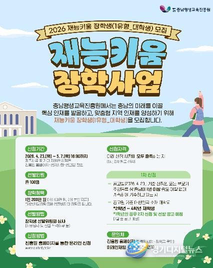 경기디지털뉴스 마성숙 기자 | 충남평생교육진흥원은 충남 인재의 성장 가능성을 발굴하고 미래 사회를 이끌 인재를 양성하기 위해 “재능키움 장학사업”을 추진한다고 밝혔다.