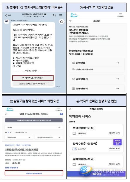 앞으로는 안내 문자 하단의 “복지서비스 확인하기” 버튼을 클릭하면 안내받은 복지서비스를 곧바로 온라인으로 신청*할 수 있어 안내부터 신청까지 한 번에 처리할 수 있게 됐다.