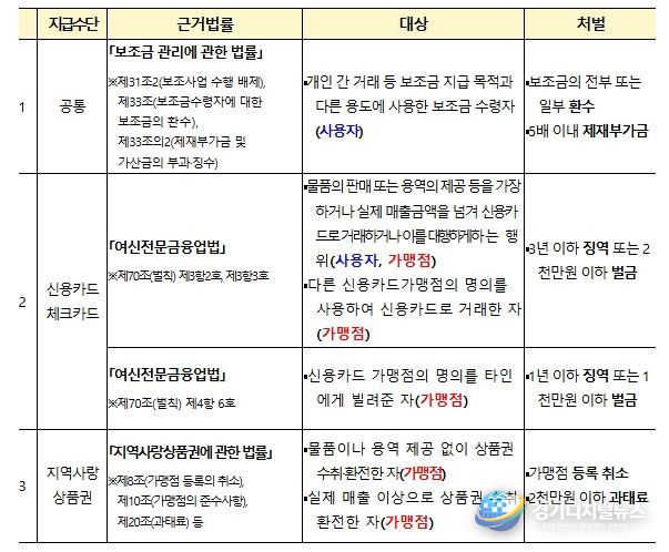 또한, 지역별 ‘부정유통 신고센터’를 운영하여 가맹점을 수시 단속하고 온라인 커뮤니티 등에서 개인 간 거래가 발생하지 않도록 모니터링을 강화해 줄 것을 각 지방정부에 요청했다.