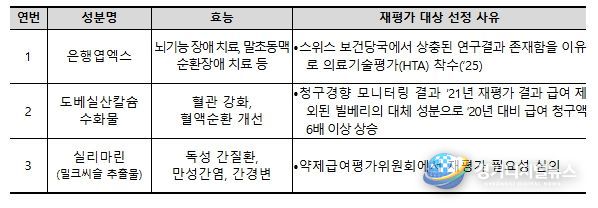 개편 평가체계에 따라 2026년도 평가 대상으로 은행엽엑스, 도베실산칼슘수화물, 실리마린(밀크씨슬 추출물) 총 3개 성분이 선정됐으며, 구체적 선정 사유는 아래와 같다.