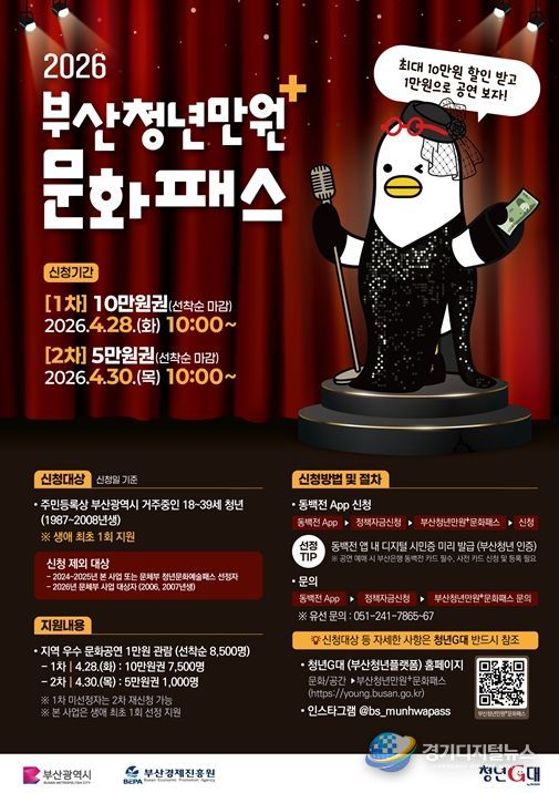경기디지털뉴스 마성숙 기자 | 부산시는 부산 청년들만 누리는 '최고 가성비' 문화생활 지원사업인 '부산청년만원+문화패스' 신청을 오는 4월 28일 오전 10시부터 동백전 앱을 통해 선착순으로 접수한다고 밝혔다.