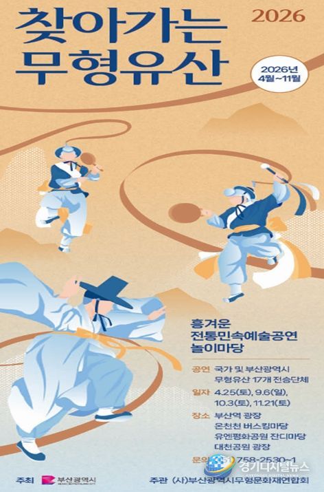 경기디지털뉴스 마성숙 기자 | 부산시는 무형유산 전통 민속예술의 가치를 확산하고, 신명 나고 흥겨운 전통 민속예술 공연으로 시민들의 삶에 활력을 불어넣기 위해 '2026 찾아가는 무형유산' '전통민속예술공연 놀이마당'을 개최한다고 밝혔다.