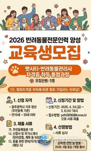 경기디지털뉴스 마성숙 기자 | 광주광역시는 반려동물 산업 성장에 대응하고 전문역량을 갖춘 인재 양성을 위한 ‘2026년 반려동물 전문인력 양성교육’을 실시한다.