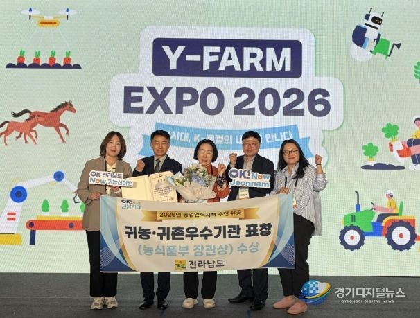 경기디지털뉴스 마성숙 기자 | 전라남도는 24일 수원컨벤션센터에서 열린 ‘2026 와이팜 엑스포(Y-FARM EXPO)’에서 농림축산식품부의 농업인력육성시책 추진 유공자 표창에서 귀농어귀촌 우수시책 추진기관으로 선정돼 장관상을 받았다.