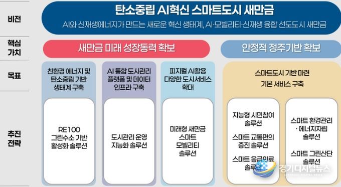 이를 실현하기 위해 ‘탄소중립 AI혁신 스마트도시 새만금’을 비전으로 설정하고, ▲ 친환경 에너지 및 탄소중립 기반 생태계 구축 ▲ AI통합 도시관리 플랫폼 및 데이터 인프라 구축 ▲ 피지컬 AI를 활용한 다양한 도시서비스 확대 ▲ 기본서비스 구축 등 4대 전략목표 및 추진전략을 마련하여 2030년까지 추진해 나갈 예정이다.