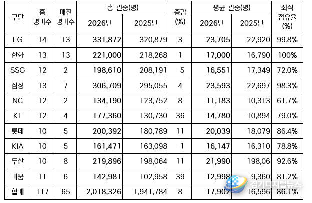경기디지털뉴스 마성숙 기자 | 2026 신한 SOL KBO 리그가 오늘(25일) 열린 잠실, 문학, 광주, 고척, 대전 경기에서 총 9만 9,905명이 입장하며 200만 관중을 달성했다.