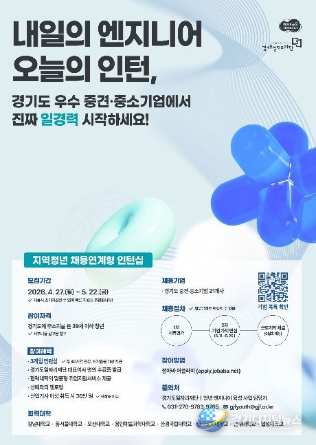 경기디지털뉴스 마성숙 기자 | 경기도일자리재단은 도내 청년을 대상으로 직무 중심의 실무 경험을 제공하는 ‘청년 엔지니어 육성 사업: 지역 청년 채용 연계형 인턴십’ 참여자를 모집한다.